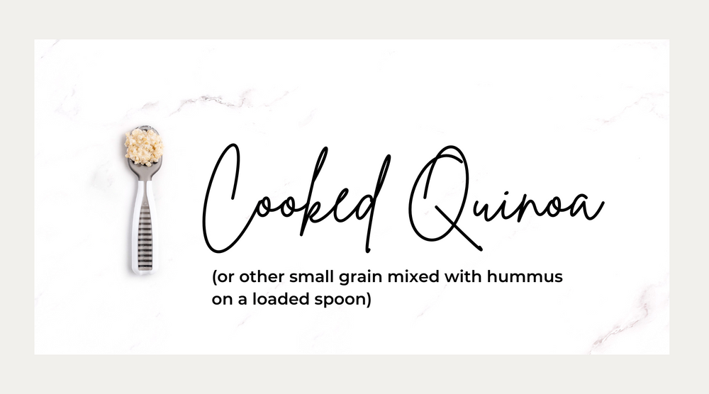 Cooked quinoa or other small grain mixed with hummus on a loaded spoon: Small grains like quinoa, rice, couscous and millet are a great option for new eaters, but they can be hard for them to pick up without a pincer grasp. (Note: quinoa is technically a seed, but culinarily it’s a grain so we’re going with grain here!) Mix it with some hummus, which contains sesame, an allergen, and offer it to your baby on a NumNum GOOtensil.