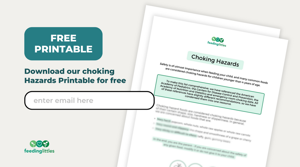 *Note: guidance varies on the safety of whole raw carrots, celery, apples and chips between ages 2 and 4. Feeding Littles has noticed a higher probability of choking with raw carrots and apples specifically in kids ages 1-3, even though they’re not on every choking hazard list. Please use caution when serving these foods, especially if they are not modified by softening or shredding.
