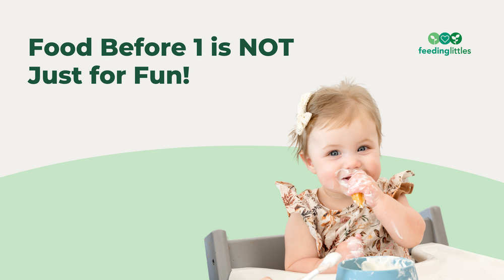 We hear the term “food before 1 is just for fun” thrown around in various Baby-led Weaning communities. The spirit of this phrase is great – don’t stress about the quantity of food your baby eats, and don’t worry if they just play – but the idea that EXPOSURE to food is unimportant before 1 could not be further from the truth for a variety of reasons. (This phrase is literally keeping some parents from offering any food before one.)