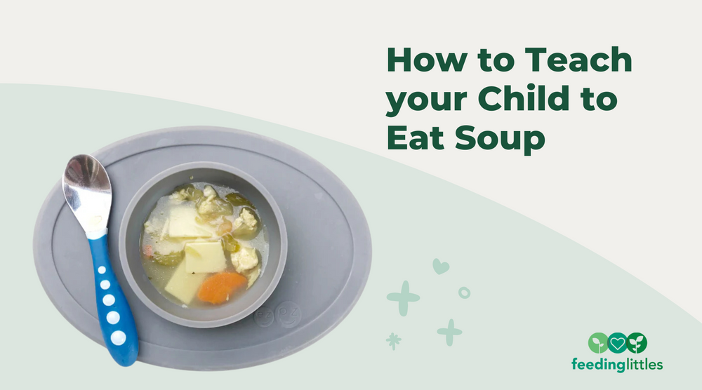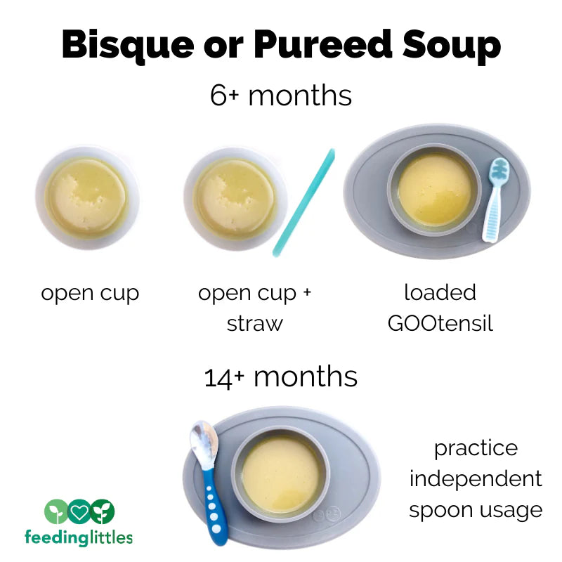 - Toddlers WILL get messy with soup when feeding themselves using a regular spoon. By around 16-18 months, most toddlers can become proficient with spoons (scooping and rotating the wrist) if they get plenty of practice, but every kid is different. Don’t get discouraged, but keep offering soup for more practice! Thicker soups help stick on spoons.