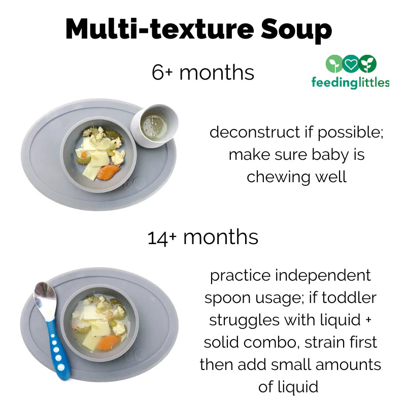 - Don’t forget to check out the last image regarding multi-texture soup like chicken noodle soup or vegetable soup. Many young toddlers will be able to eat chicken noodle soup or veggie soup as is, but sometimes a soup with both broth (a thin liquid) and noodles in it can be hard for kids who just want to swallow without chewing first. If your child isn't chewing well, strain the broth from this soup first. You can add small amounts of it as your child becomes more proficient.