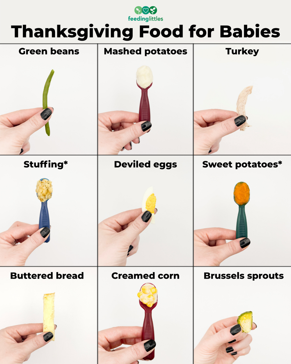 This gets down to personal preference. It’s recommended to avoid added sugar in infants when possible, but we also believe in balance when it comes to nutrition. Many families give baby a scoop of pumpkin pie filling or a bit of apple pie or cranberry sauce to enjoy. Do what feels best to you! (Yes, as a pediatric dietitian and Baby-led Weaning expert, I gave my babies sugar-containing foods on Thanksgiving!)