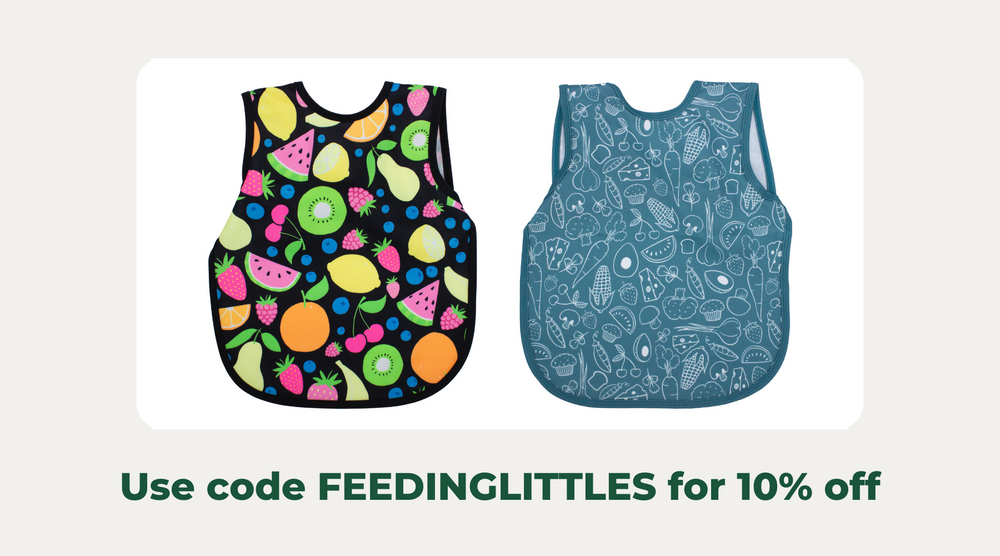 Baprons are the only bib we recommend because they tie around the torso, not the neck, and babies love to wear them. (Most babies start to pull off bibs by 10 months old, but not Baprons!) Perfect for sizes 6 months - 3T, Baprons are amazing at keeping kids' clothes clean while allowing them to explore and get messy with food. Wash them in the sink, dishwasher or washing machine and let them air dry quickly. Since they’re made from a waterproof material, your child can eat just about anything and still keep their clothes spotless. Our clients always say to us, “Once you go Bapron you’ll never go back!”
