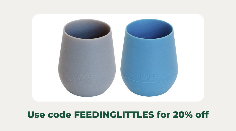 We recommend practicing cup drinking starting at 6 months of age when you introduce solid foods. Our favorite first cup is the ezpz Tiny Cup, since it’s weighted at the bottom, small for small hands and easy for your baby to learn to use. Open cups are recommended before you try any other types of cup, and the Tiny Cup makes it much easier for your baby to learn to drink water or other liquid!