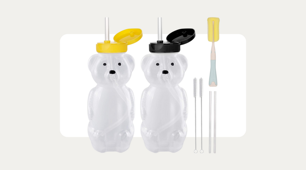 After your baby learns how to drink from an open cup, it’s time for a straw cup! We love the Honeybear Cup because it makes straw drinking so easy – simply put water in the cup, squeeze the bear’s tummy and watch water go up the straw! Once your baby figures out how to use a straw, you can use any type of straw cup.