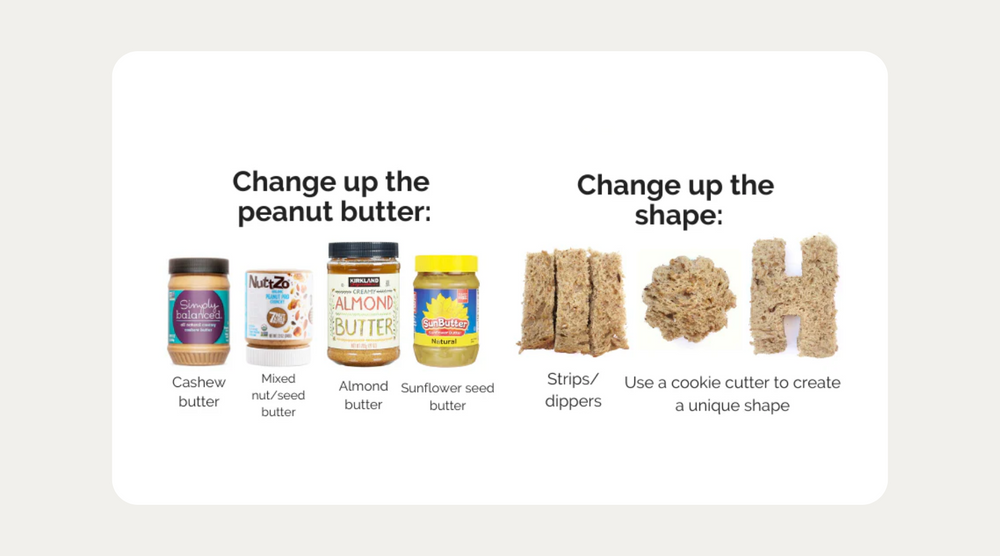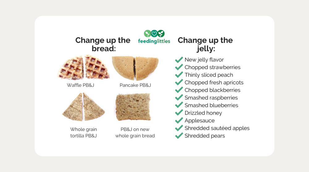 If your child is allergic to peanuts (or tree nuts) or if your school is peanut/tree nut-free, sunflower seed butter, granola butter, soy butter or cream cheese can be safe alternatives. Our book Feeding Littles Lunches has allergy swaps for all 75+ lunches - there is surely an option your child will love!