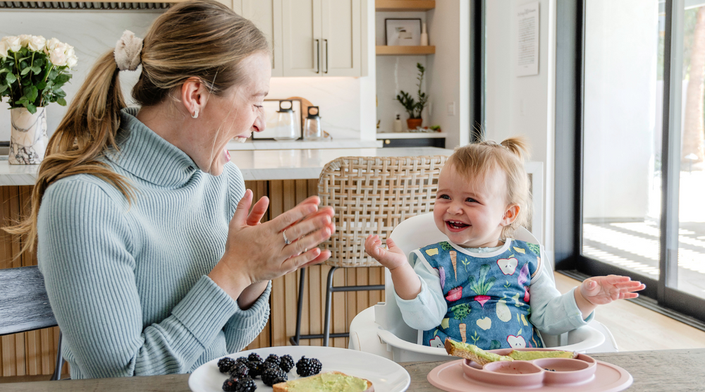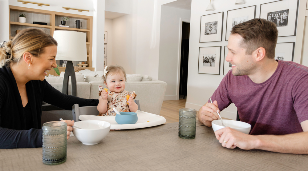 3. Eat with your baby. Babies learn about the world through watching us, so it’s imperative that we eat with them when they’re learning how to eat. They observe us picking up food, putting it in our mouth and chewing it, and they learn that it’s OK to try different foods on their plate because we are eating them too. Make sure your baby’s chair is right next to the table so they’re included in the mealtime experience and can see you eat.