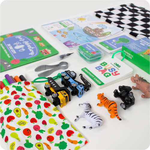 This Busy Bag contains a thoughtfully curated range of items that promote both independent and family-wide play, plus a set of Creativity Cards that offer unique, fun ways to use the items together.