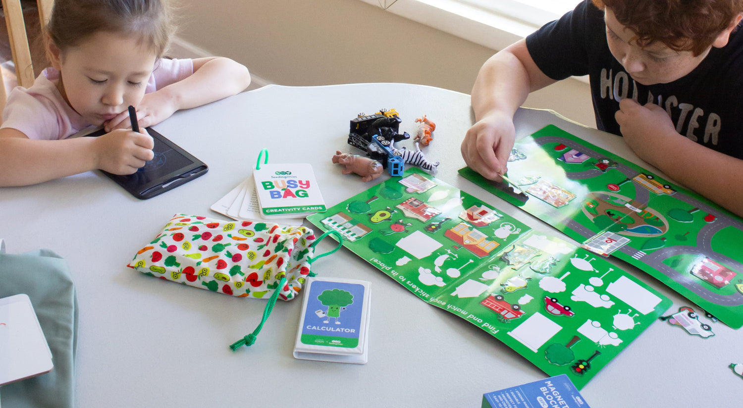 We worked with developmental specialists and educators to include high-quality items that can be used for all sorts of play - drawing, guessing games, motor-based play, imaginative play, sorting, filling containers, math and language games, and much more.