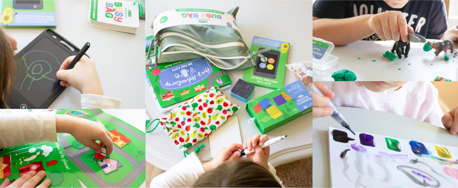 Megan and Kelsey are moms who have worked in the kid feeding space for over a decade. We are excited to offer parents a solution to long restaurant wait times, all while creating opportunities for connection and fun at the table. Our Busy Bag can be used anywhere kids need to sit still and wait, and it makes a thoughtful gift!